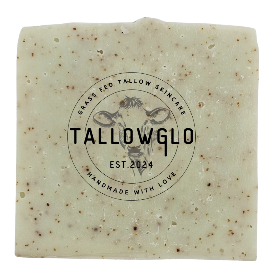 Elevate your skincare routine with our Tallow Lemongrass Scrub Soap, expertly crafted to exfoliate, cleanse, and invigorate your skin. Made with 100% saponified grass-fed organic beef tallow and enriched with French green clay*, finely ground walnut shell, and lemongrass essential oil*, this soap offers a perfect blend of nourishment and exfoliation for a truly revitalizing experience.